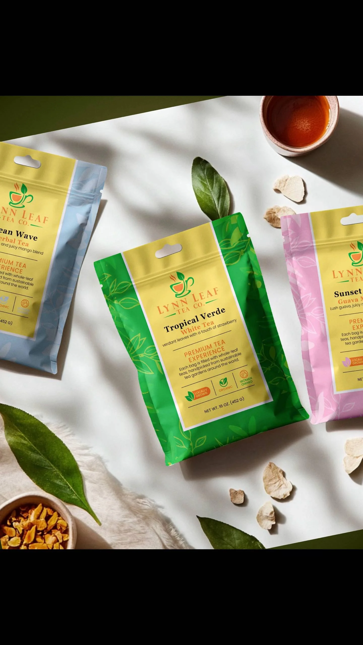 Lynn Leaf’s Tea is an artisanal tea brand offering hand-crafted blends made with organic ingredients, available through their online store. I was tasked with designing a series of tea bag packages that visually communicated freshness and hydration, while aligning with the brand’s colorful, tropical aesthetic. The designs were tailored to appeal to health-conscious, active consumers seeking natural, wellness-focused products.